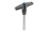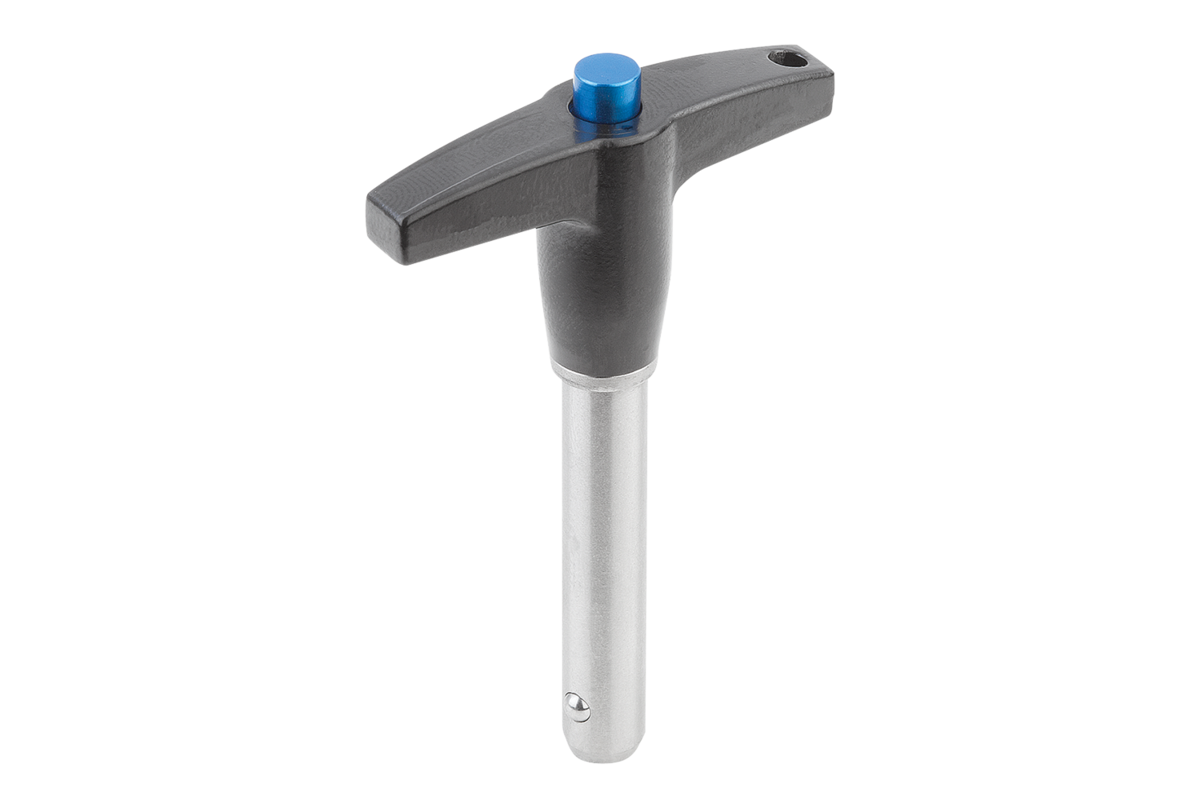 Bolzen gehärtet min. 40 HRC und passiviert. Griff schwarz eloxiert. Druckknopf blau eloxiert. Kugeln gehärtet 58 +4 HRC und passiviert. Druckfeder passiviert.