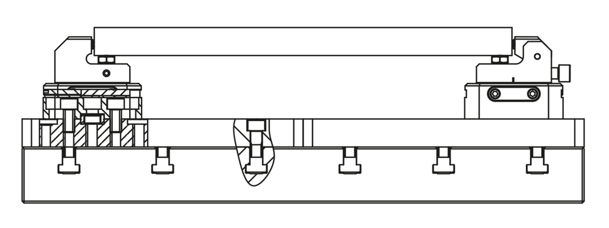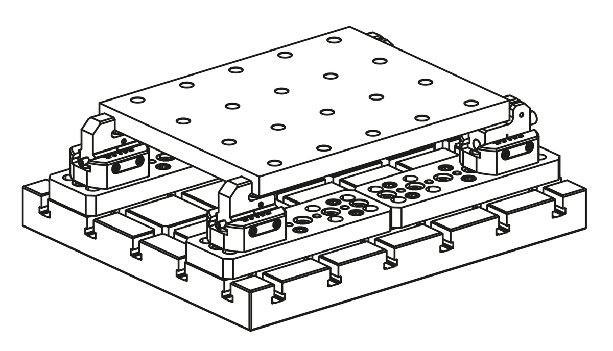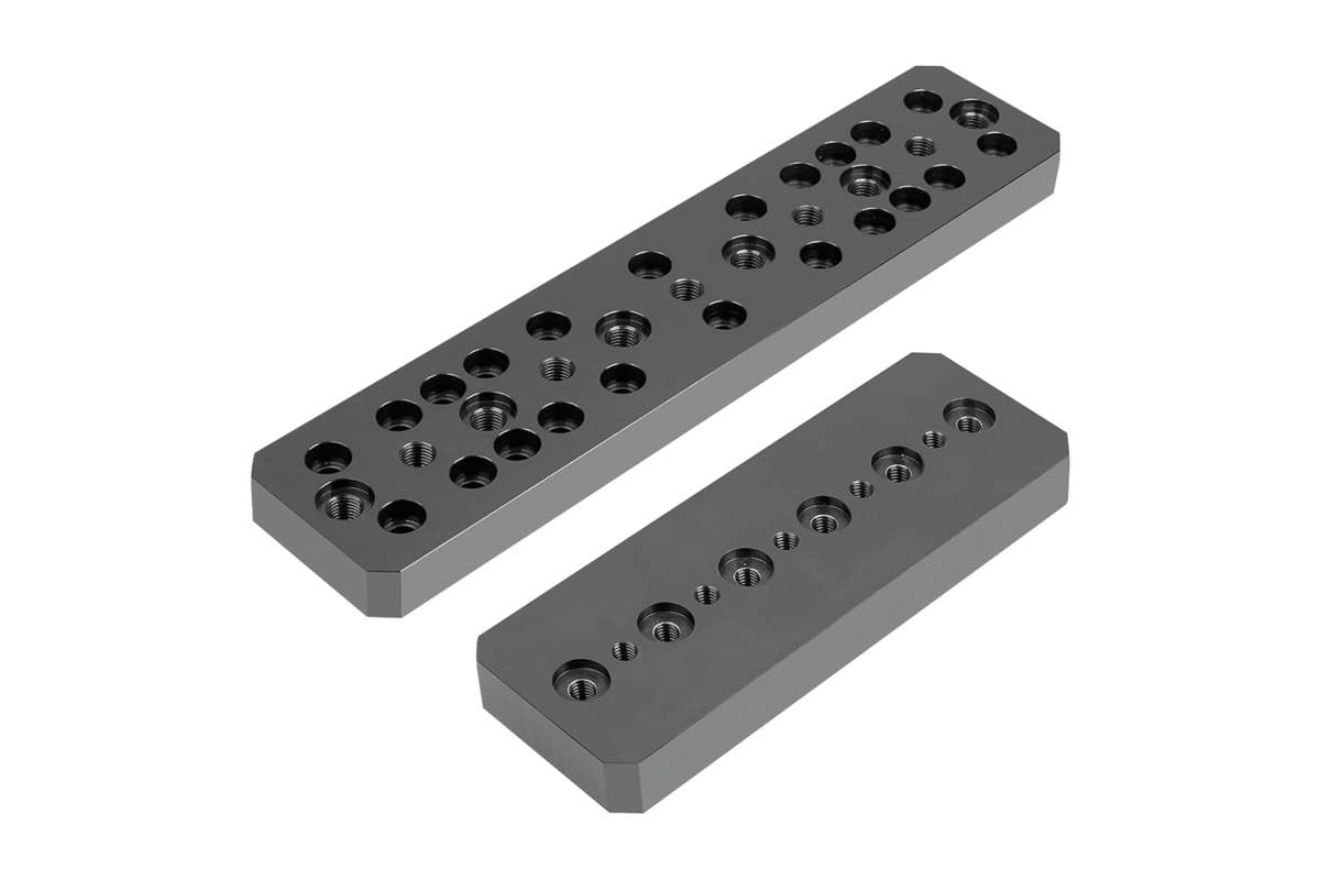 Adapterplatten zur flexiblen Anwendung von Spannelementen und Festanschlag auf T-Nuten.