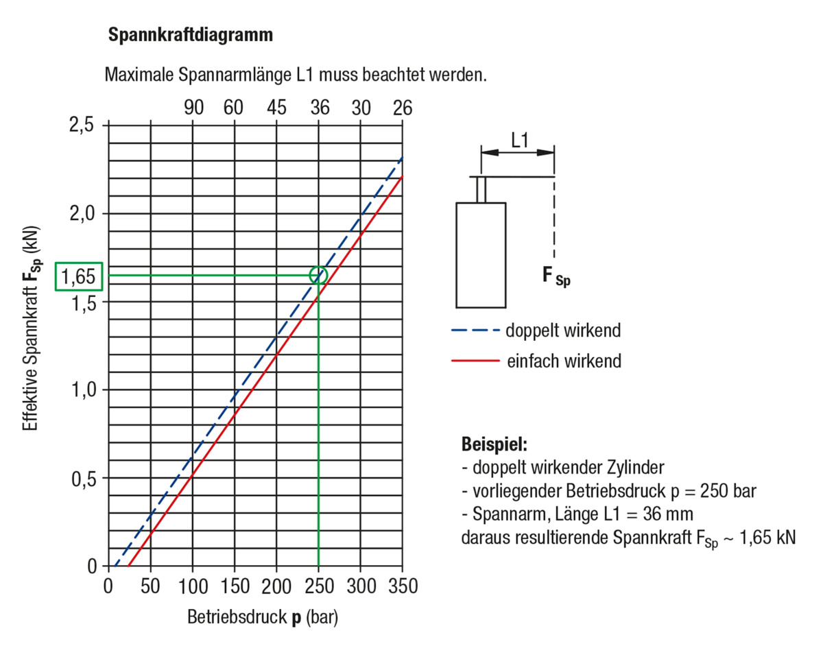 Die Diagramme zur Spannkraft der Schwenkspanner sind für die Dimensionierung der Spannarme maßgebend.