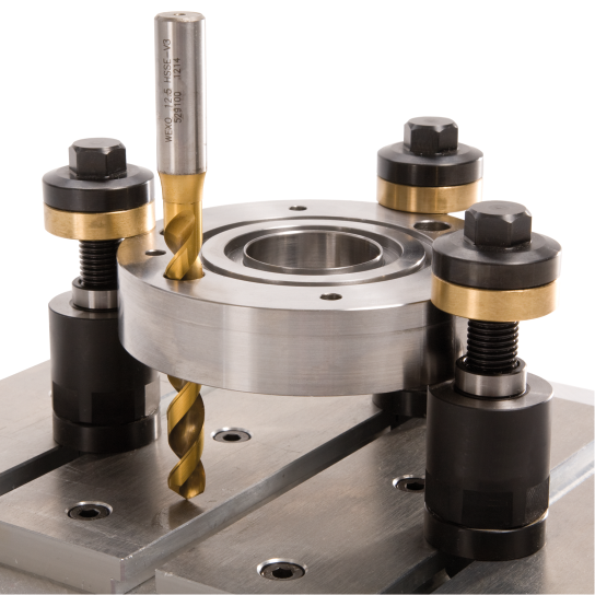 Die Aufspannbolzen können mit Nutensteinen direkt auf dem Maschinentisch befestigt werden. Durch enge Toleranzklassen (js6) in der Höhe wird ein paralleles Aufspannen zum Tisch gewährleistet. Der Spannbereich beträgt 8 – 40 mm. Zusätzlich erhältlich sind Spannschrauben für die Spannbereiche 40 – 67 und 65 – 87 mm. Die Zwischenscheibe verhindert Beschädigungen am Maschinentisch sowie ein Verschieben beim Festziehen. Der Spannring aus Messing verhindert Abdrücke am Werkstück.