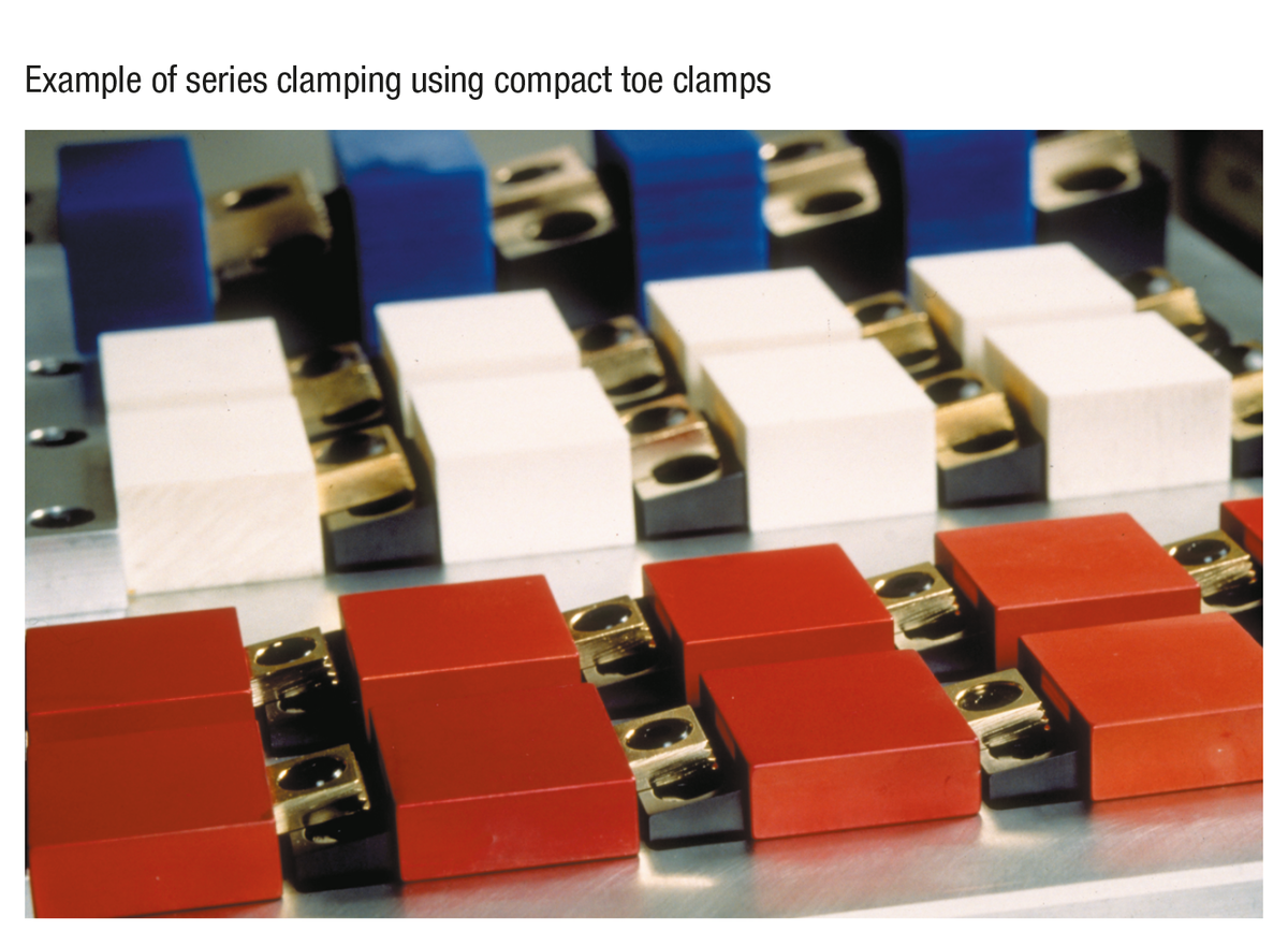 This cam action compact toe clamp requires very little space to produce multi-fixture clamping.
