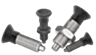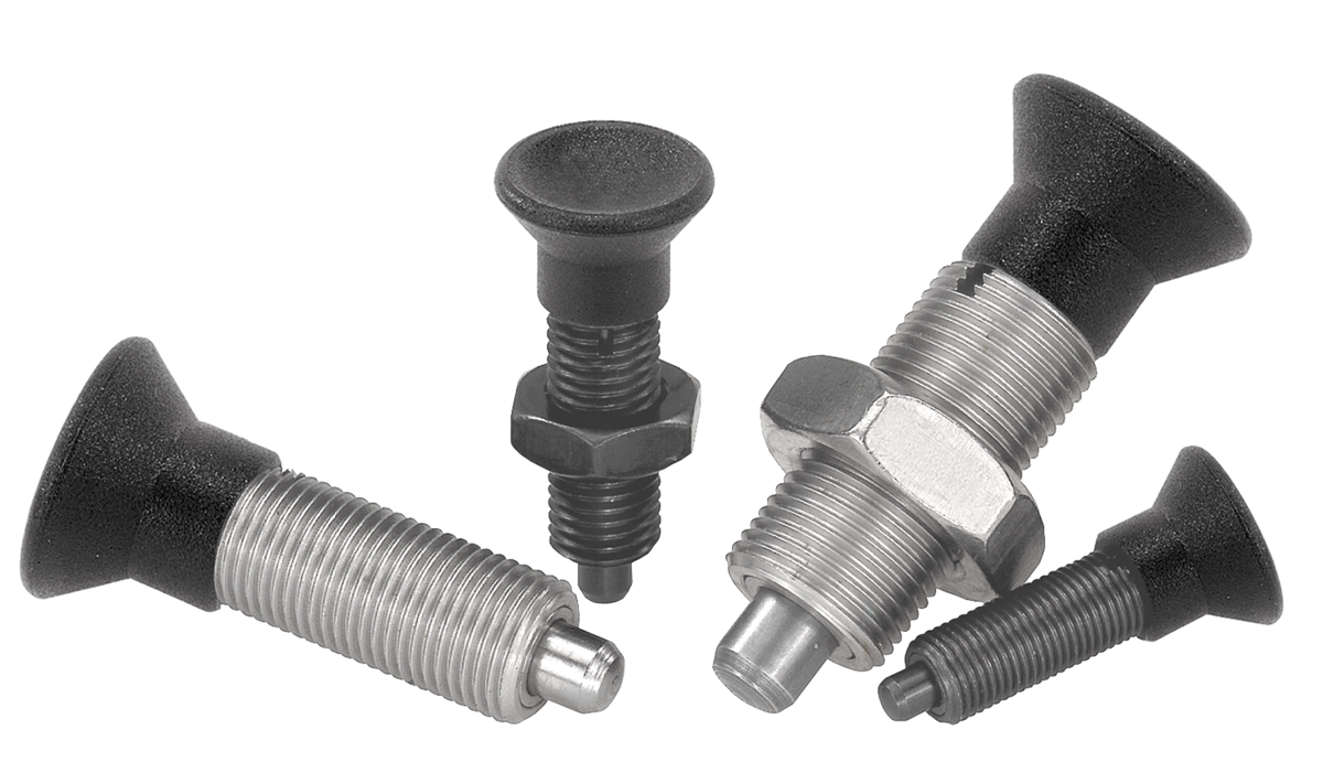 Indexing plungers, steel or stainless steel, without collar, with plastic mushroom grip and locknut