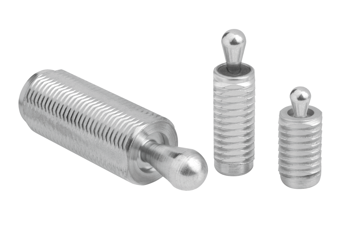 Lateral spring plungers with threaded sleeve can be individually adjusted to suit the the part being held. The threaded sleeve is also suitable for screwing into thin sheet metal as it can be fastened with one or two nuts.