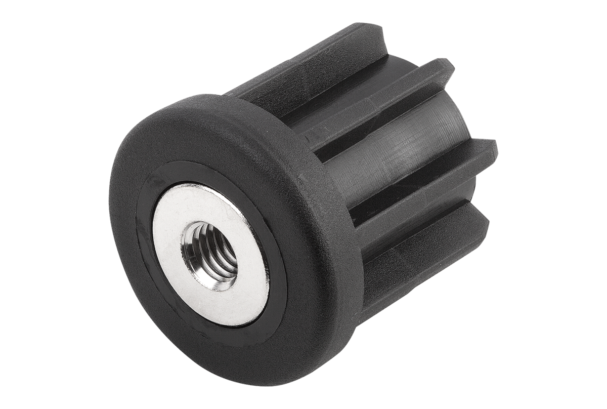 Threaded round inserts for attaching levelling feet, swivel feet and castors to round tubes.