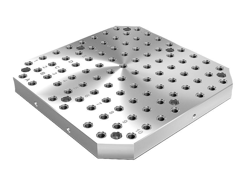 Plates with grid holes are used for constructing modular fixtures. These plates are positioned and fastend directly on machine tables.